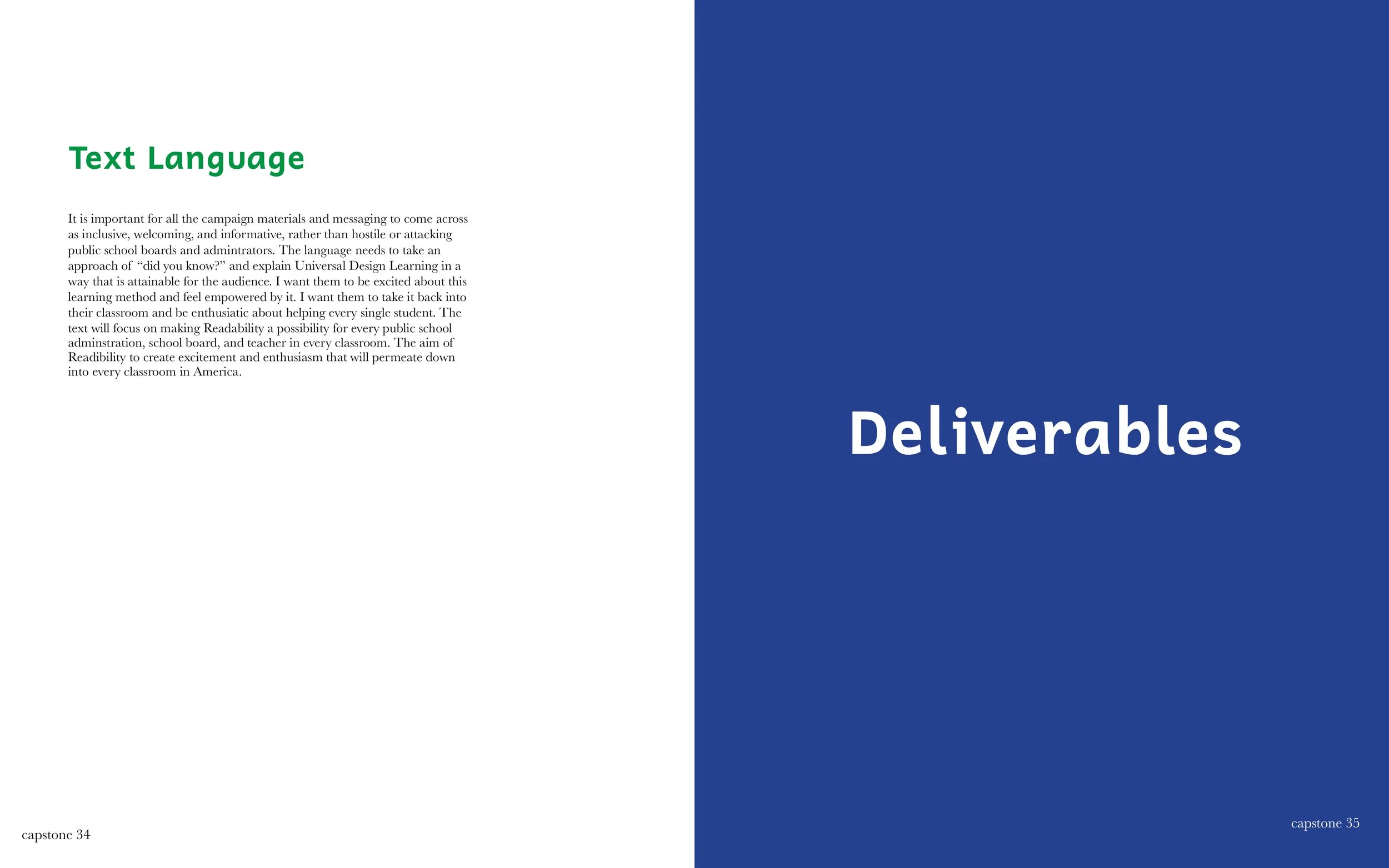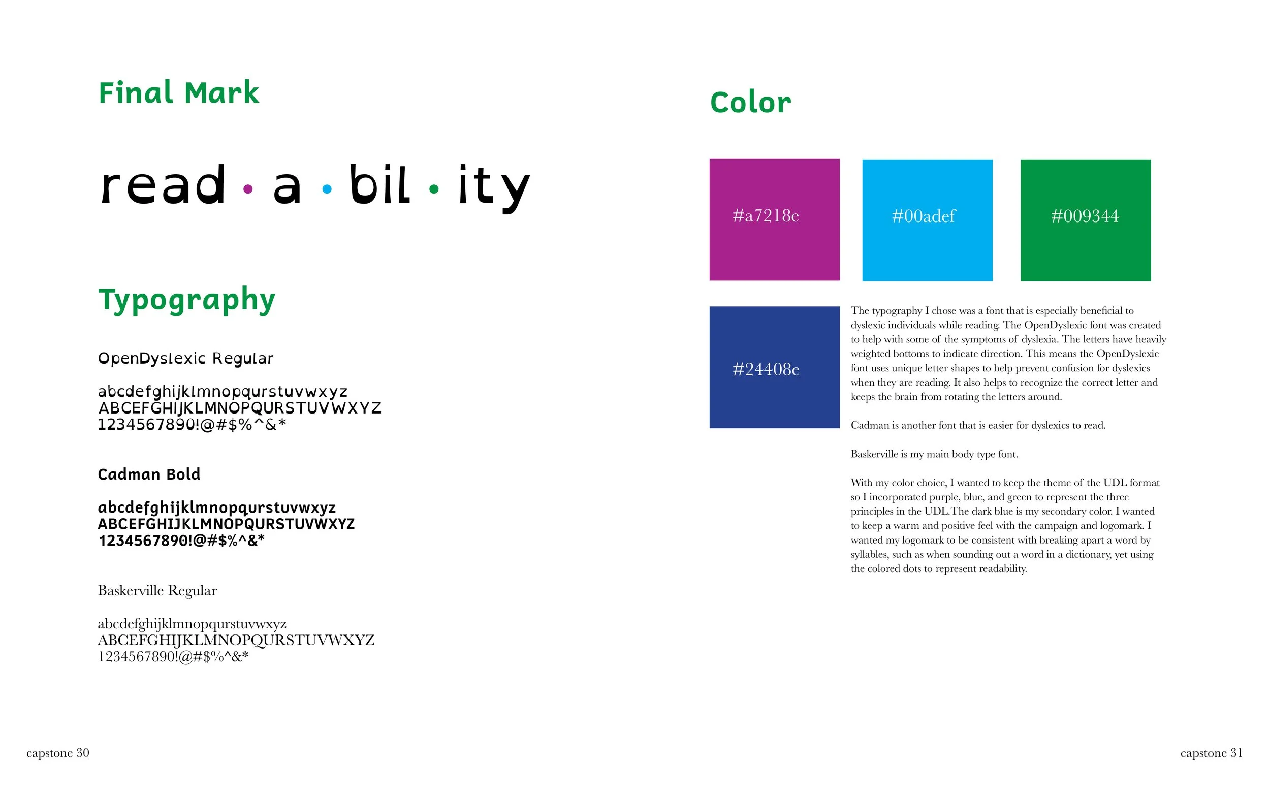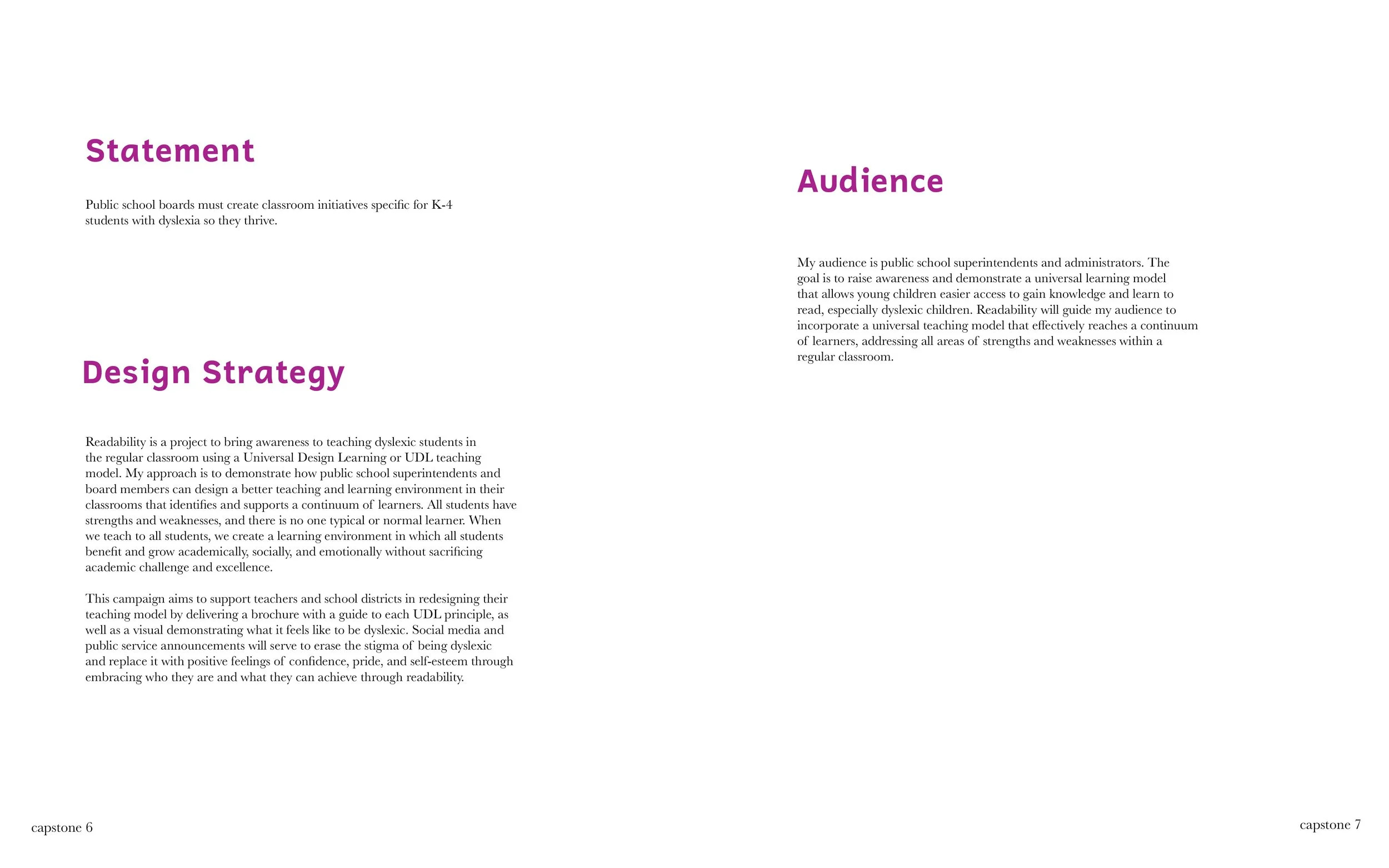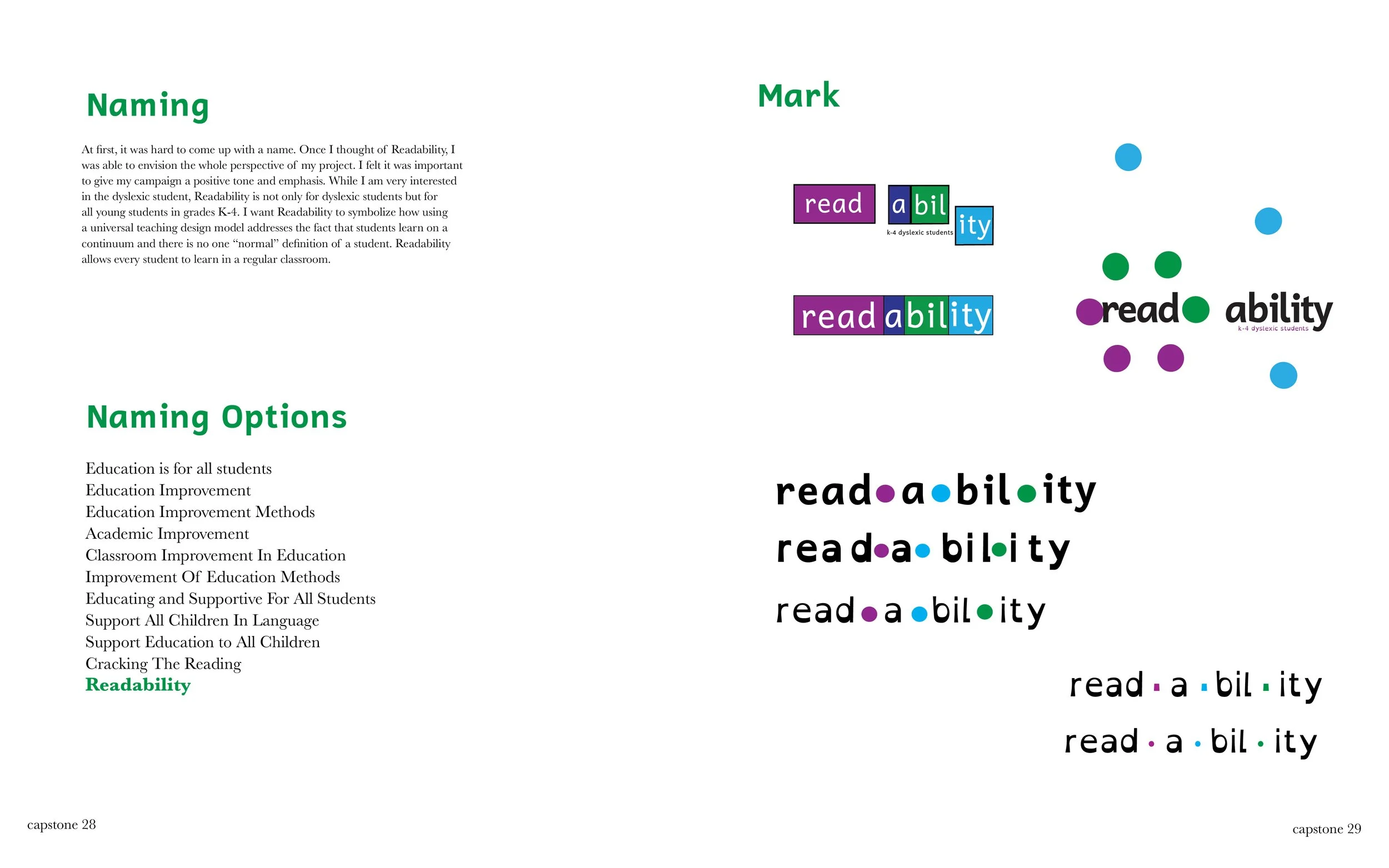 Capstone was a senior project in my BFA degree. I spent an entire semester researching dyslexia students and the education they receive in public schools. My project is called Readability and I created brochures and materials to help educate public school board members, principals, superintendents, and state legislators about the most effective ways to educate young students with dyslexia.