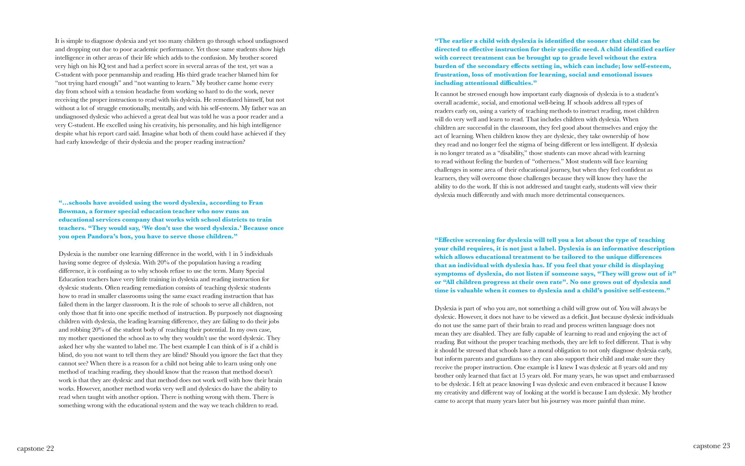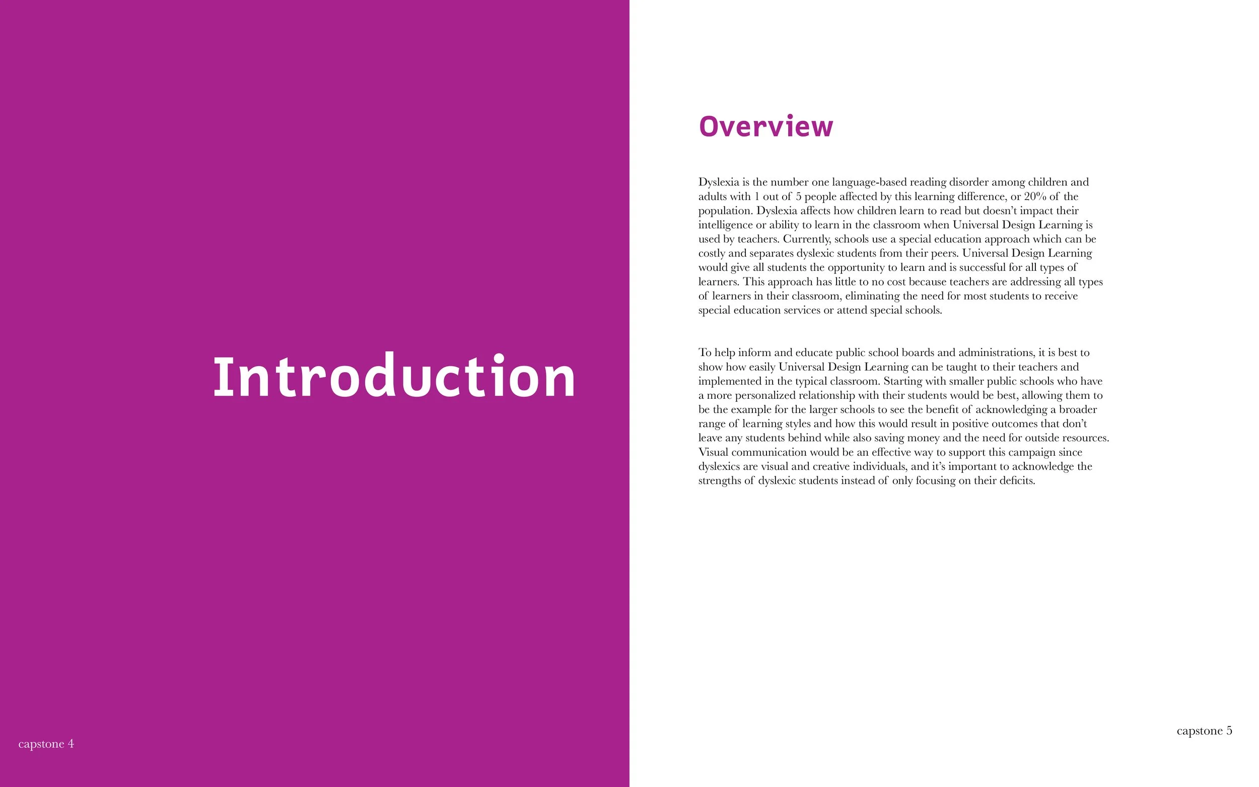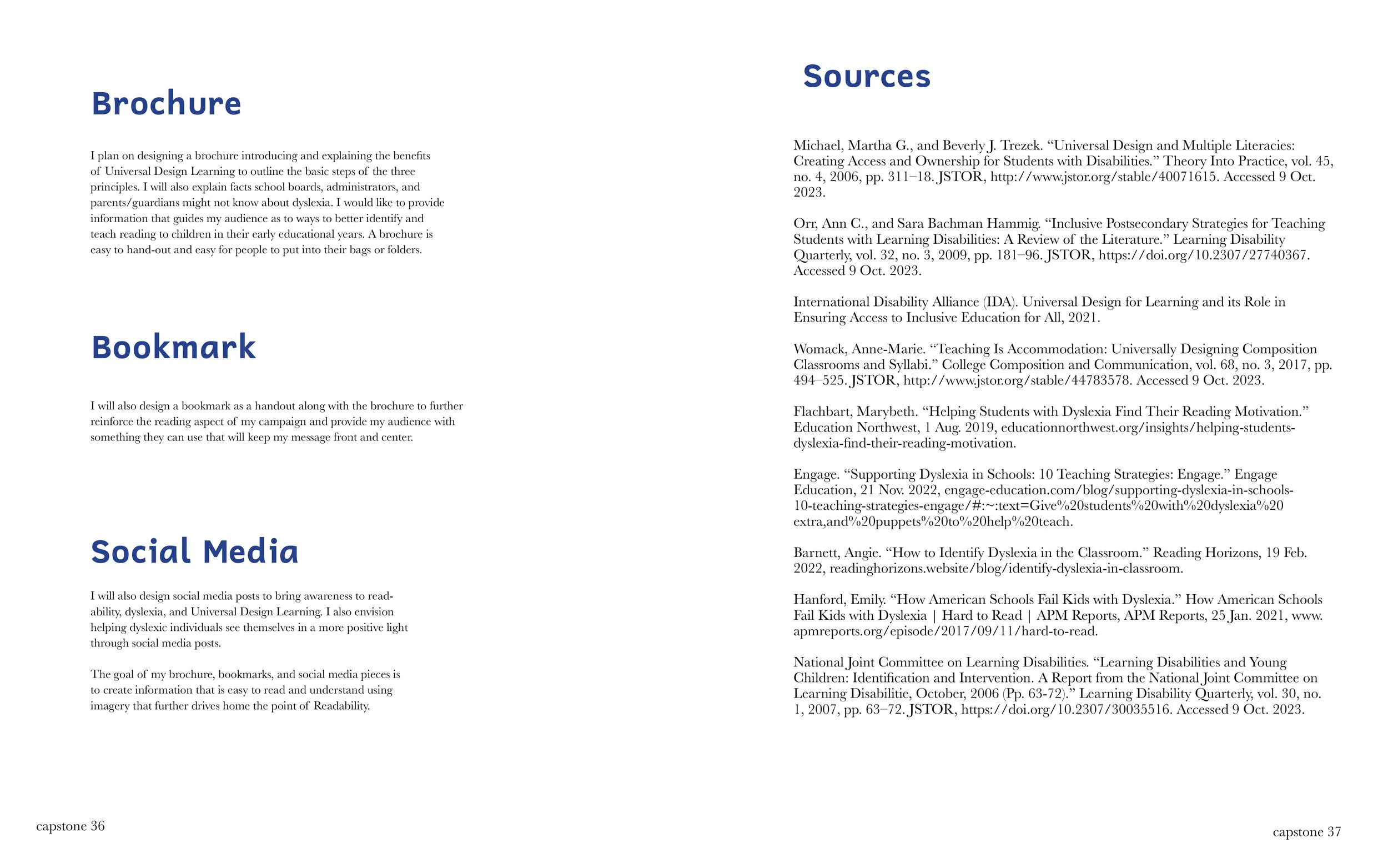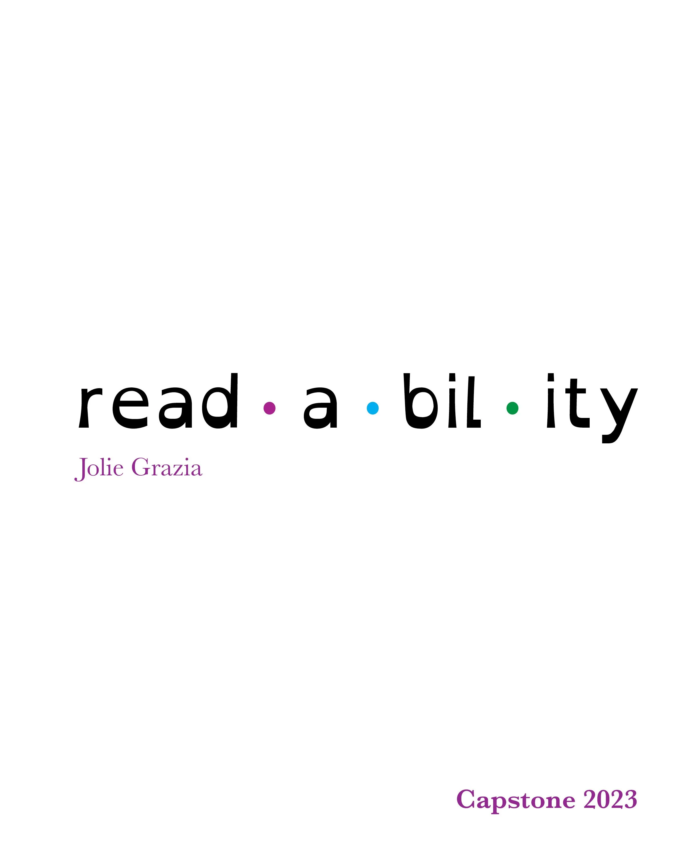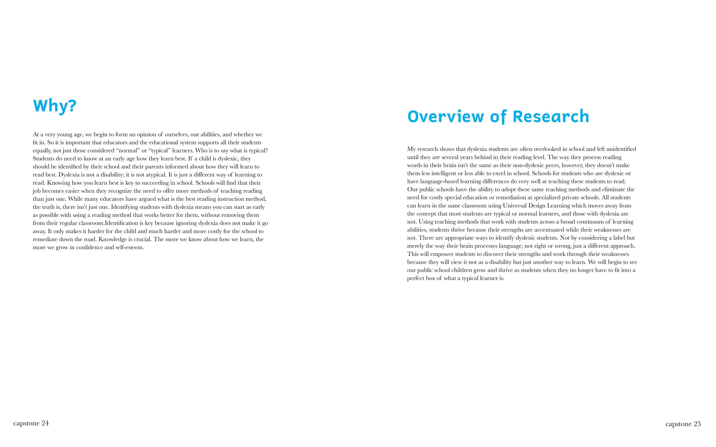 Capstone was a senior project in my BFA degree. I spent an entire semester researching dyslexia students and the education they receive in public schools. My project is called Readability and I created brochures and materials to help educate public school board members, principals, superintendents, and state legislators about the most effective ways to educate young students with dyslexia.